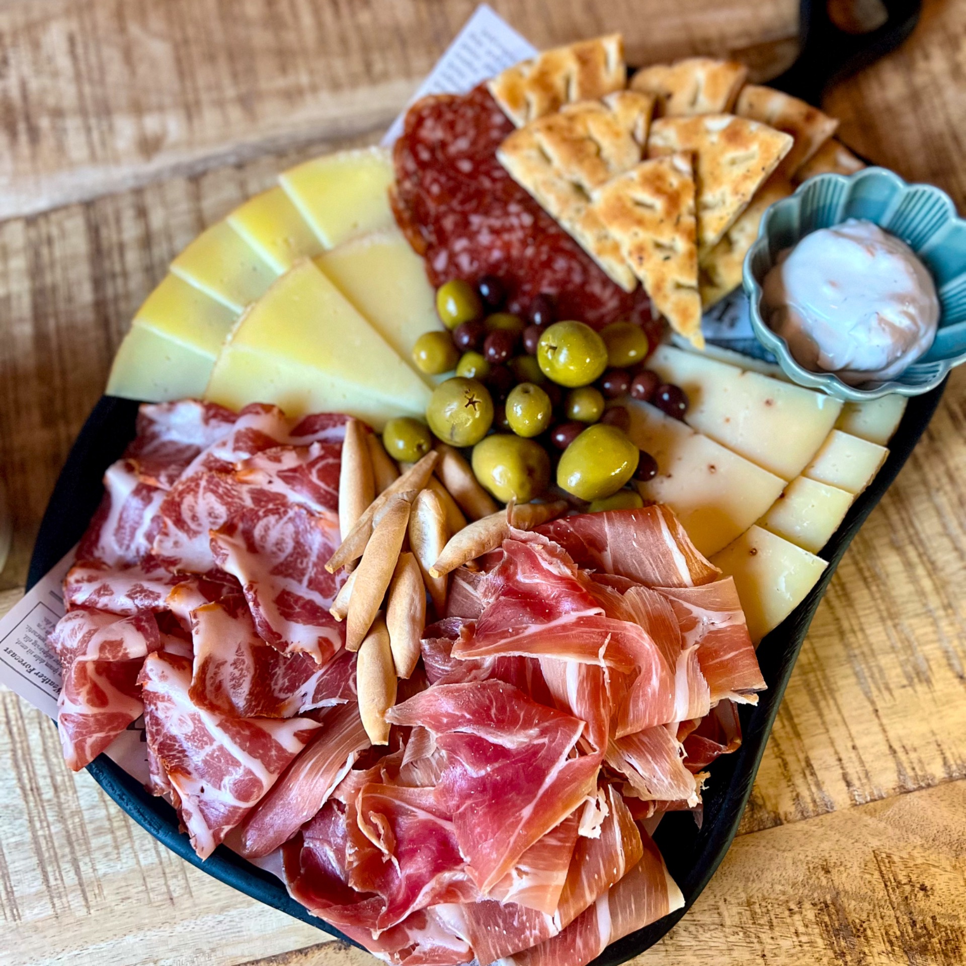 Obložená misa z výberových delikates (syry, salámiky, šunka dusená, sušená), plus variácia nátierok (podľa vášho výberu 2ks po 100g: cesnaková, jamón, vajíčková, mediteran, guacamole.